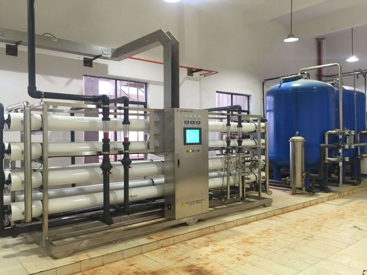 反渗透设备是采用膜分离手段来去除水中的离子,有机物,胶体微粒、细菌等杂质,使水达到脱盐纯化的目的。其原理是水与溶液以渗透膜相隔,水则向溶液渗透,两相之间有渗透压,若在溶液相上加压,使压力大于渗透压,则溶液中的水就会向水相反渗透去,利用反渗透而取得脱盐水。即原水在足够的压力下,通过渗透膜而变成纯水,没有通过膜的水,其溶解物、悬浮物的浓度逐渐增大,作为浓水排出。